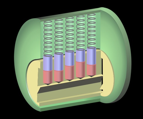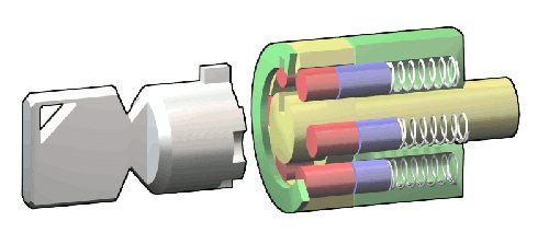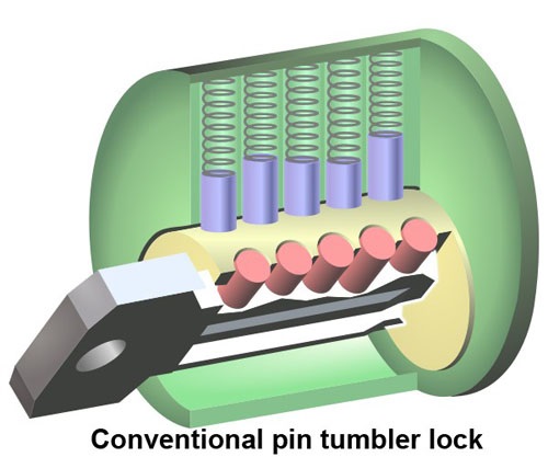 Trước tiên, chúng ta cần hiểu rõ về cấu tạo và cách hoạt động của một ổ khóa thông thường, loại khóa được sử dụng phổ biến nhất là khóa lẫy. Cấu tạo chính của một khóa lẫy bao gồm một trục khóa hình trụ, bên trong có các lẫy nhỏ hay còn gọi là pin với độ dài ngắn khác nhau. Các pin này đi theo từng cặp có thể tách rời, gồm phần động (màu đỏ) và phần tĩnh (màu xanh, gắn liền với một lò xo nhỏ).