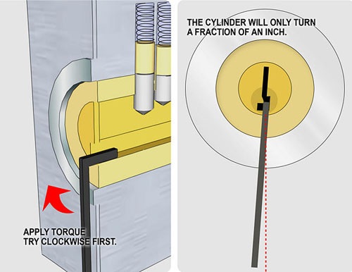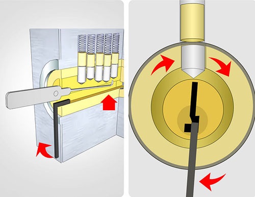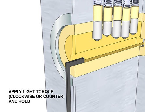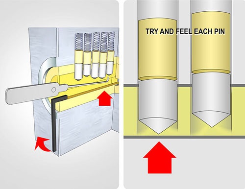 Bước 4: Đưa lock pick vào ổ khóa và xác định các pin nằm ở phía trên bên trong trục khóa. Bạn có thể thử đẩy các pin lên bằng lock pick và cảm nhận lực lò xo sẽ đưa các pin này về vị trí ban đầu. Nếu cảm nhận thấy các pin này khó đẩy lên, hãy giảm lực xoay trục khóa.