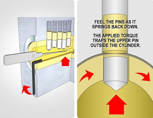 Bước 5: Xác định pin nào khó đẩy lên nhất và bắt đầu từ pin đó. Sử dụng lock pick để đẩy pin đó lên với áp lực vừa phải, trong khi vẫn xoay trục khóa bằng thanh kim loại còn lại. Mục đích của bạn là đẩy phần pin tĩnh lên khỏi trục khóa, sau đó khi bạn thả ra pin động sẽ rơi xuống. Đồng thời lực xoay trục khóa sẽ dẫn đến sự không thẳng hàng giữa lỗ pin trong trục khóa và phần vỏ, do đó pin tĩnh sẽ ở yên bên trên. Sau đó, nếu bạn thử lại bằng cách đẩy chân pin lên mà không thấy lực đẩy trở lại của lò xo tức là bạn đã thành công.